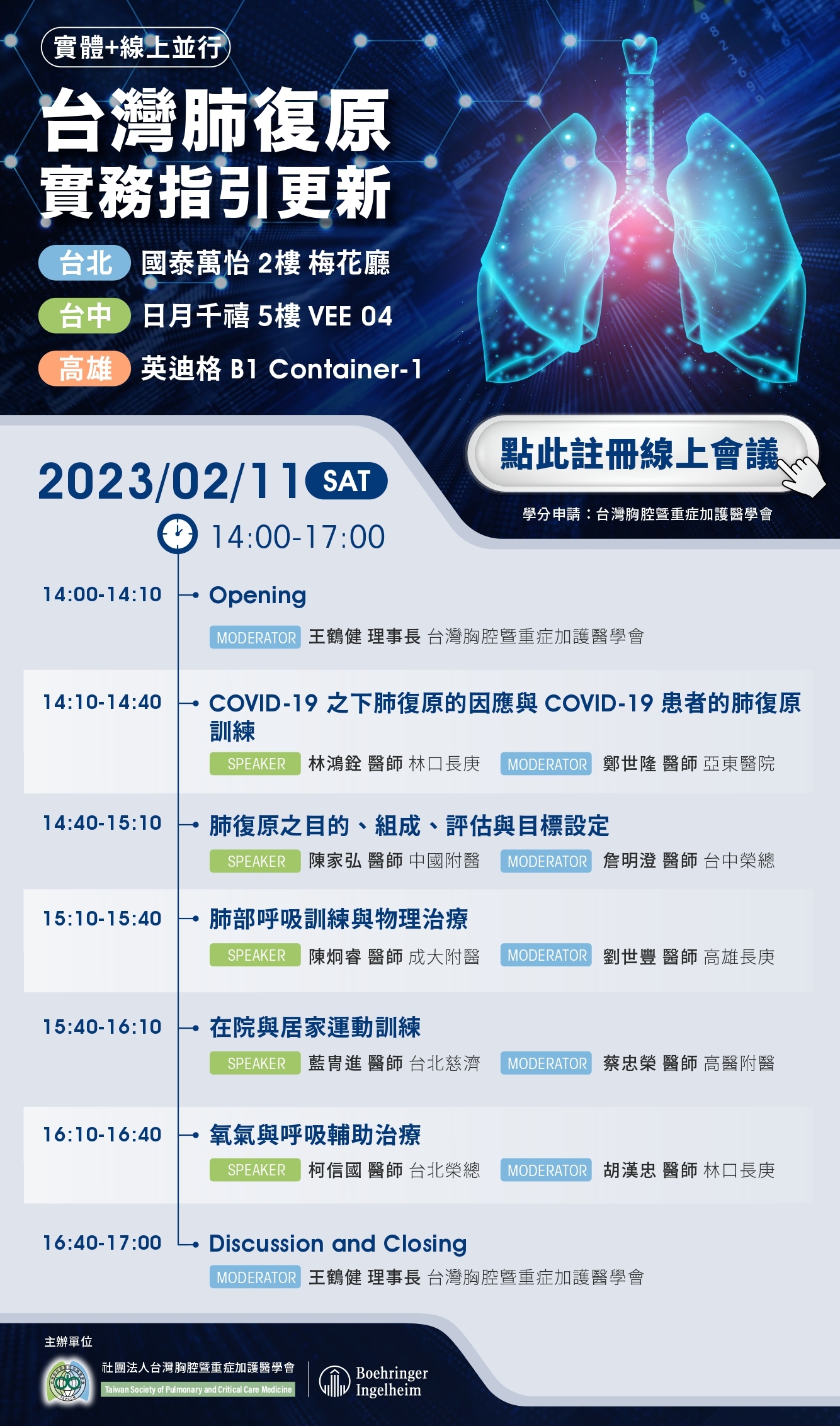 【線上會議】請點這另開視窗前往線上會議 (於活動當天14:30前登入,可獲得學分)【學 分】台灣胸腔暨重症加護醫學會