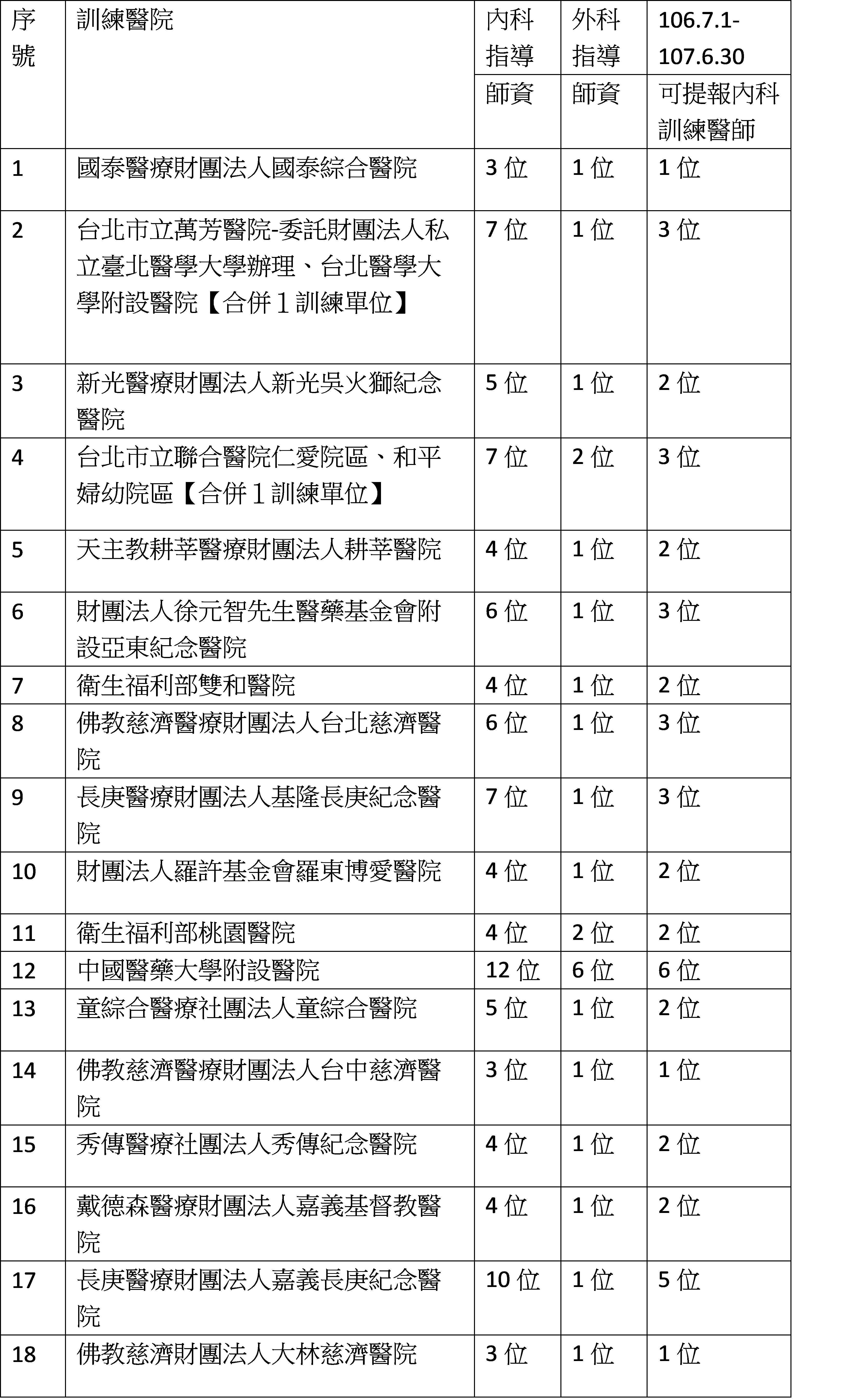 訓練醫院名單,提報【胸腔內、外科受訓醫師容額】自106.7.1起至107.6.30止